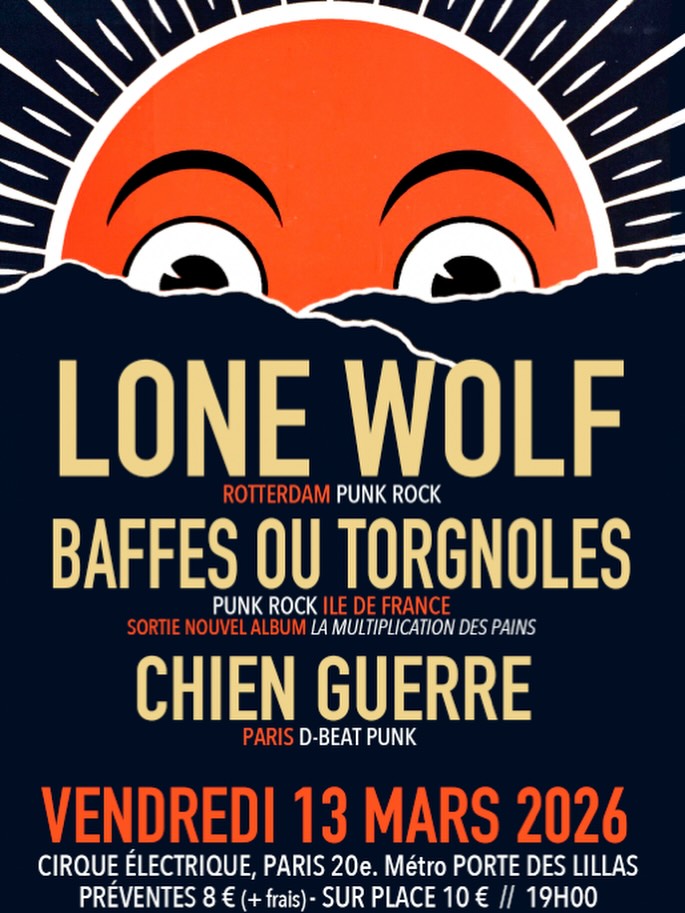 ⚡ LONE WOLF (Rotterdam, Hollande) ”Catchy melodies and high energy punk rock”, proclame le label Stardumb Records à la sortie, l'an passé, du quatrième album de Lone Wolf, ”Dark Thoughts”. La description peut paraître simpliste mais elle décrit parfaitement le style du quatuor, dont le CV des quatre musiciens ressemble à un Top 5 du punk-rock batave des années 2000 (The Accelerators, Giant Eagles, The Bat Bites, The Apers, The Windowsill). ”This is indie punk as emotional armor, and it fits like a battle-worn leather jacket.” — addtowantlist.com ▶︎ https://wearelonewolf.bandcamp.com/album/dark-thoughts https://www.facebook.com/wearelonewolf ⚡ BAFFES OU TORGNOLES (Ile de France) Les Franciliens, connus pour leur punk-rock caustique mais néanmoins corrosif, célébreront la sortie de leur nouvel album ”La Multiplication des Pains” sur Guerilla Asso. Ce soir-là, ce sera donc Baffes ET Torgnoles pour tout le monde. ▶︎ https://baffesoutorgnoles.bandcamp.com https://www.facebook.com/BaffesOuTorgnoles ⚡ CHIEN GUERRE (Paris) Créé début 2025, Chien Guerre est composé de Fab (REVOK / DO YOU COMPUTE / GAMENESS), Lionel (PORTOBELLO BONES / GRANIT 665 / COPENHAGEN), Jules (MONDA DI MIERDO / ACTION DIRECTE) et Jey (PSP / CHANMAX RECORDS). Ouverture de soirée explosive annoncée ! ▶︎ https://chienguerre.bandcamp.com/ www.instagram.com/chien.guerre