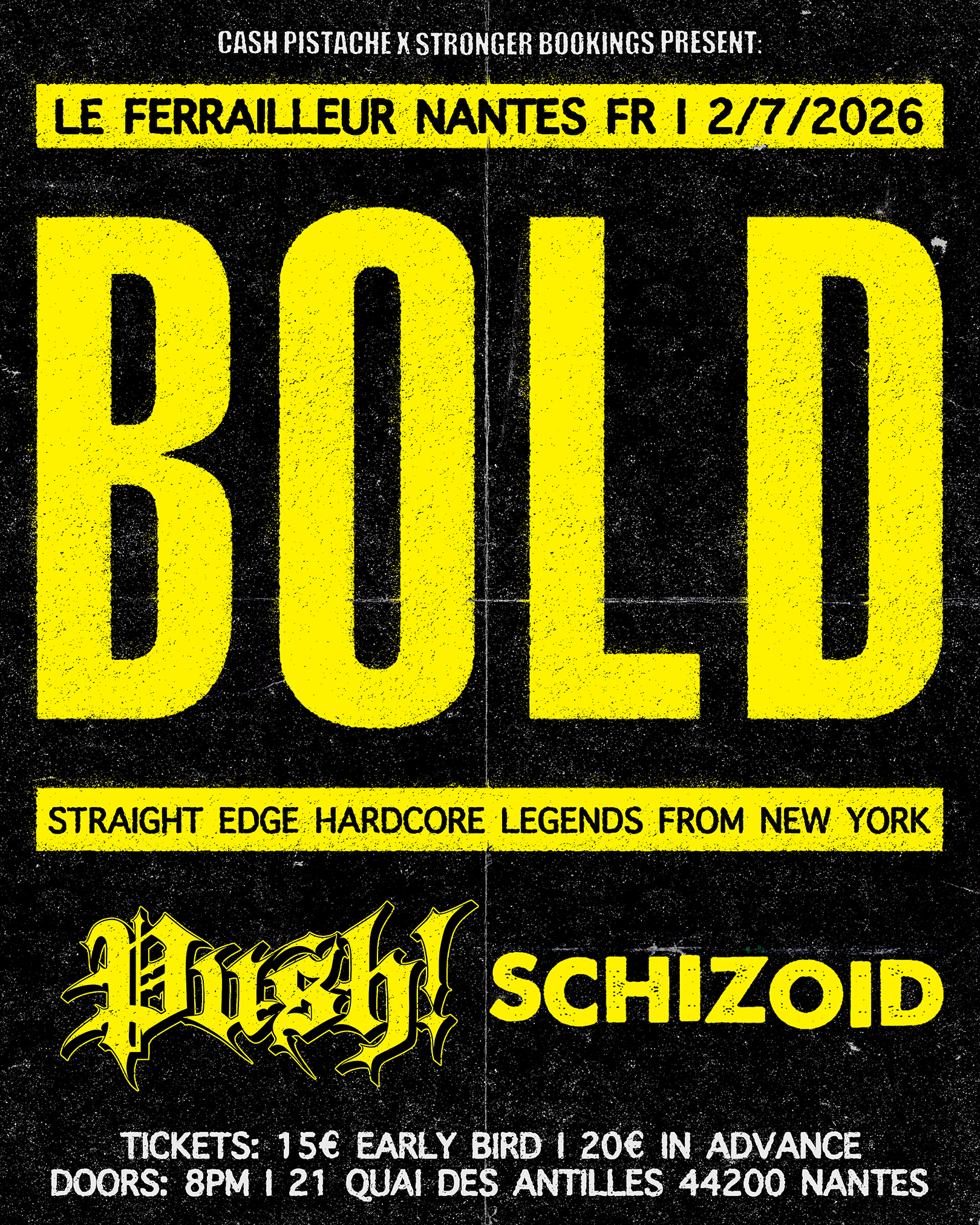 On accueille des légendes du NYHC Straight Edge - Bold s'arrêtent à Nantes pendant leut tournée européenne! Pionners dans la scène Youth Crew depuis la fin des années 80's, en piochant leur influences avec des groupes comme Bad Brains ou Cro-Mags - un honneur de recevoir cette formation mythique!
