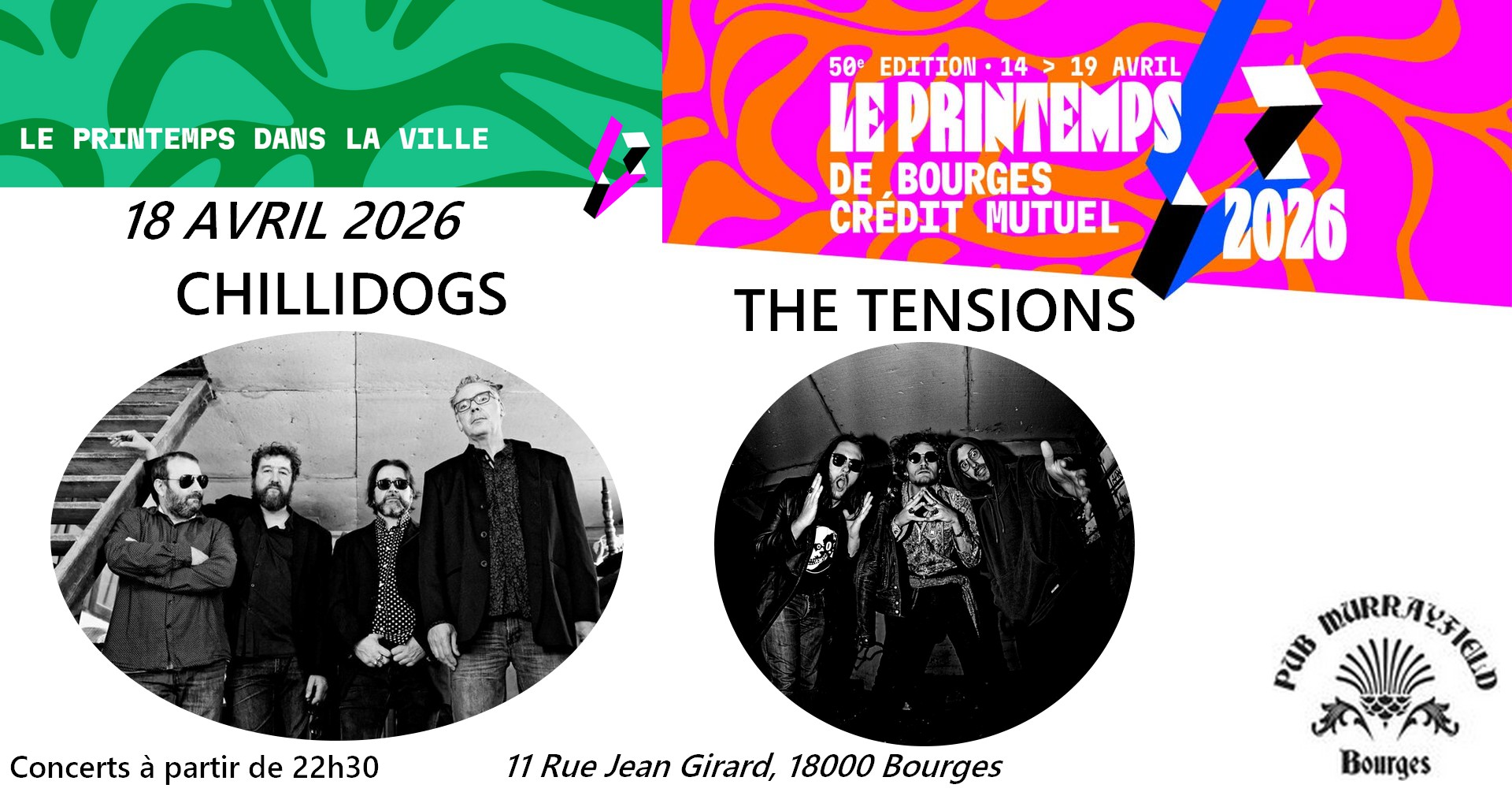 ——————————— Samedi 18 Avril 2026 Concerts à 22h30 ——————————— 🍺 PUB MURRAYFIELD 11 Rue Jean Girard, 18000 Bourges