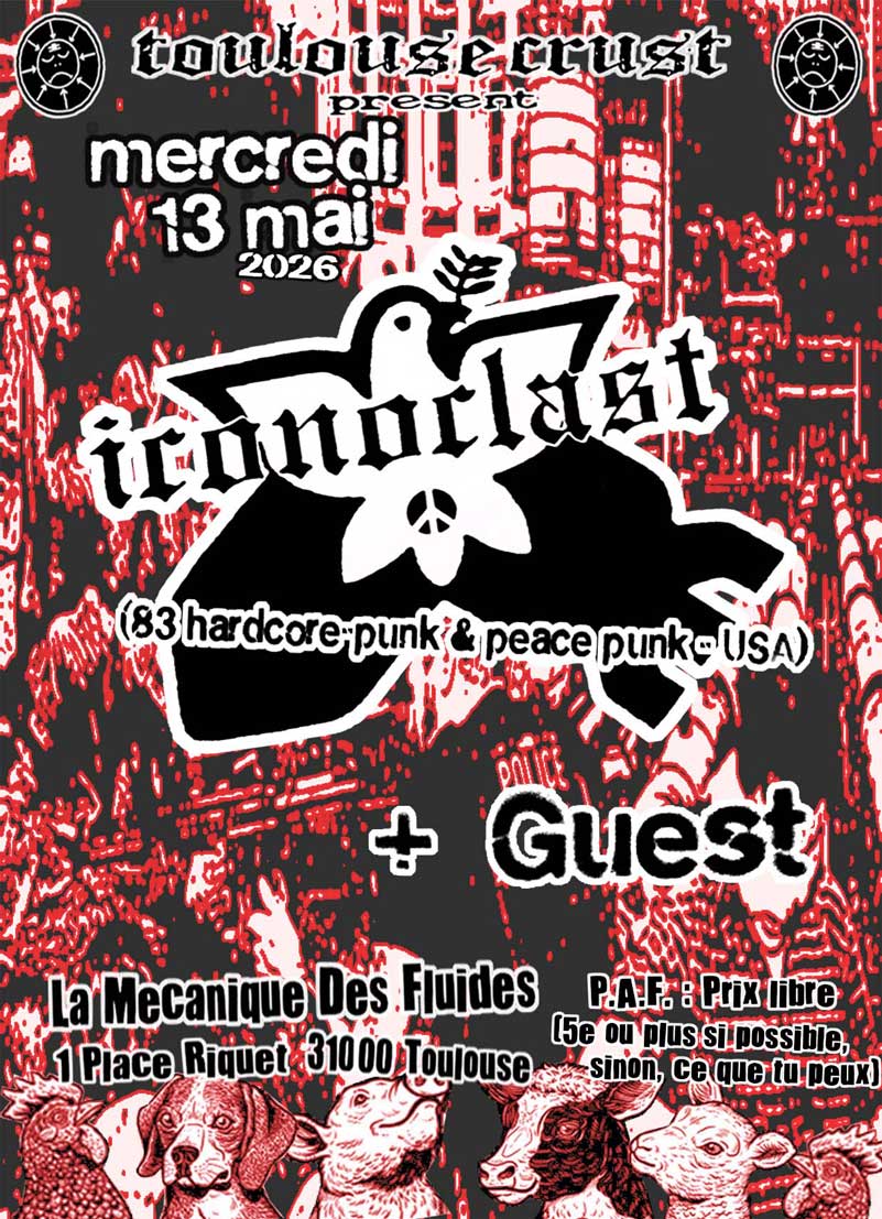 ICONOCLAST, le groupe "histoire" hardcore-punk du début des 80's, vient en europe pour le festival Malas Artes à Barcelone et en profite pour faire une excursion à Toulouse :) ICONOCLAST faisait partie de la scène hardcore-punk & peace punk américaine du début des années 80, aux côtés de groupes comme CRUCIFIX, BODY COUNT, AGAINST, ANOTHER DESTRUCTIVE SYSTEM, DIATRIBE, ARMISTICE et A STATE OF MIND. Ces groupes idéalistes, fortement influencés par CRASS, brillaient au sein de la scène punk radicale californienne de l'époque. Le son d'ICONOCLAST était proche de celui de DISCHARGE, des premiers ANTISECT ou de WRETCHED, tandis que leurs textes, engagés et directs, étaient politiquement impliqués. Ils ont joué lors de concerts de soutien à la cause animale, à la lutte contre le nucléaire, l'apartheid, les violences policières et à Big Mountain.